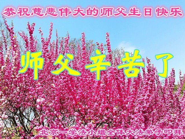 慈悲伟大的师尊生日快乐!您辛苦了!大法弟子想念师尊!我们北京大法弟子会听师尊的话,修掉后天形成的观念,以纯正的慈悲、祥和多救人,抓紧时间、圆容整体,珍惜时间、珍惜机缘、珍惜众生、珍惜自己,在学法中,不断升华境界,惟愿师尊笑,跟师尊回家。北京大法弟子跪拜! 北京大法弟子恭祝慈悲伟大的师尊生日快乐!普天同庆5·13世界法轮大法日!