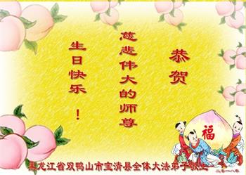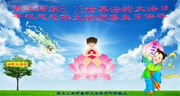 黑龙江省肇东市大法弟子夫妻二人恭祝师尊生日及世界法轮大法日,庆祝法轮大法洪传二十六周年。 黑龙江省双鸭山市宝清县全体大法弟子恭祝慈悲伟大的师尊生日快乐!