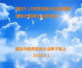 1992年的5月13日,是人类历史上一个光辉的日子,法轮佛法传遍了中国,传向了世界。“五一三”也是我一生最永远记住的日子。二十六年,师恩难忘,难忘师恩。弟子不懈怠,走好师尊安排的路,勇猛向前,完成使命。谢谢慈悲伟大师尊。 河北省保定教育系统大法弟子恭祝世界法轮大法日暨慈悲伟大的师父生日快乐!