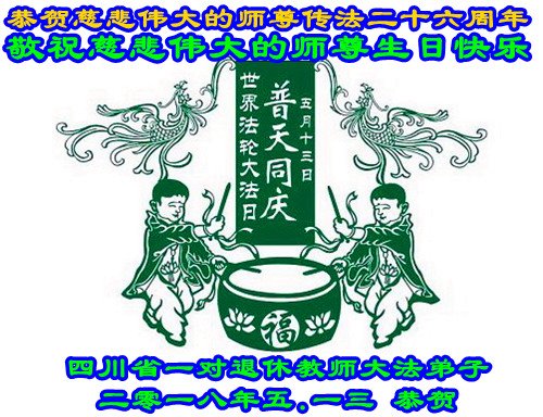【明慧网二零一八年五月九日】 四川省一对退休教师大法弟子恭祝慈悲伟大的师尊传法二十六周年!敬祝慈悲伟大的师尊生日快乐!