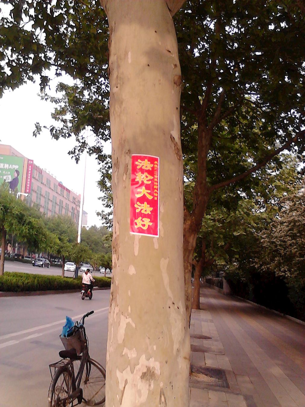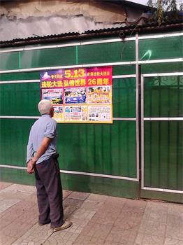 河北某地普天同庆五一三世界法轮大法日,粘贴大量标语、展板还悬挂许多条幅。使世人看到大法的美好,明白大法真相得以救度。 一大法弟子到某村去粘贴,一不明真相的村民看到后喝令大法弟子揭下来,大法弟子没揭反劝他说:这不能揭,这是救人的,你不愿让贴我可以不在你这贴。我大老远来你们村,只是希望你们平平安安、明白大法真相得到救度。我要不来去打工怎么一天也得挣百八十吧,你想想我为的什么呀!这是救人的,我不会揭你也不能揭,谁揭对谁不好。这时又一村民插言说:人家法轮功就是了不起,都是自费制作的。不明真相的村民若有所思也不再制止了。 还有一大法弟子粘贴时,一人看到后,大声说:法轮大法好!我喜欢,贴我家墙上吧!大法弟子高兴的在他家门口一边贴了一张。他高兴的说:谢谢啊! 辽宁某市庆5·13不干胶