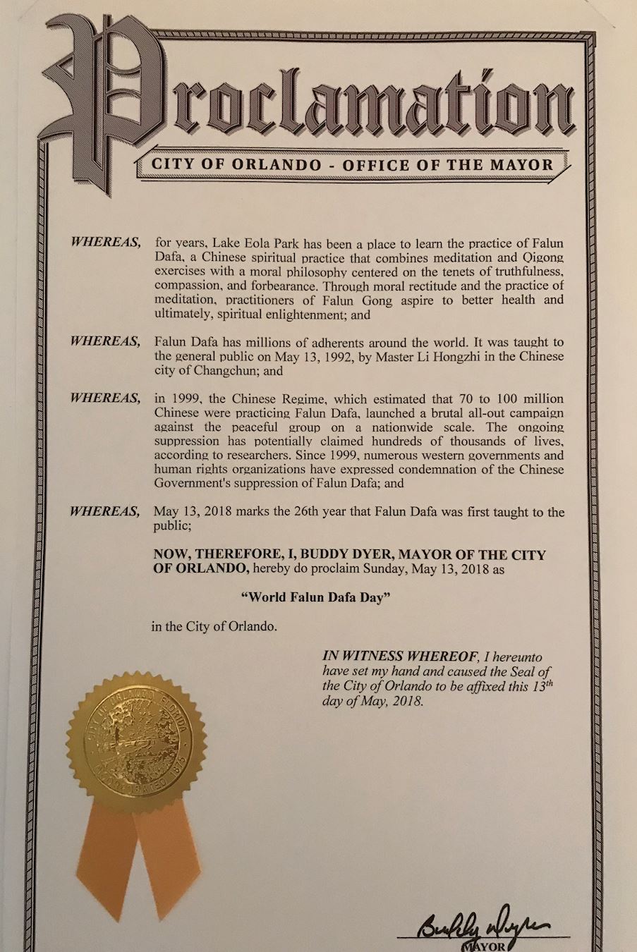 褒奖状译文如下: 鉴于,多年来,艾拉湖公园(Lake Eola Park)一直是学习法轮大法,炼功的地方。法轮大法是一种传统的气功与打坐修炼,强调道德升华,以真、善、忍为原则。通过提升道德和打坐修炼,修炼者增进身体健康,最终实现开慧开悟; 鉴于,法轮大法在世界各地拥有数百万的修炼者。一九九二年五月十三日,李洪志大师在中国长春市开始传播法轮功; 鉴于,一九九九年估计有七千万到一亿中国人在修炼法轮大法,中国(中共)政府在全国范围内发起了对这一和平信仰野蛮的全面迫害。根据研究人员,持续的迫害可能夺走了数十万人的生命。自一九九九年以来,众多西方国家政府和人权组织对中国(中共)政府镇压法轮大法表示谴责; 鉴于,二零一八年五月十三日是法轮大法首次向公众洪传的第二十六周年; 因此,现在,我,奥兰多市市长巴迪·代尔(Buddy Dyer)宣布二零一八年五月十三日星期天,为奥兰多市“法轮大法日” 奥兰多市市长 巴迪·代尔(Buddy Dyer)