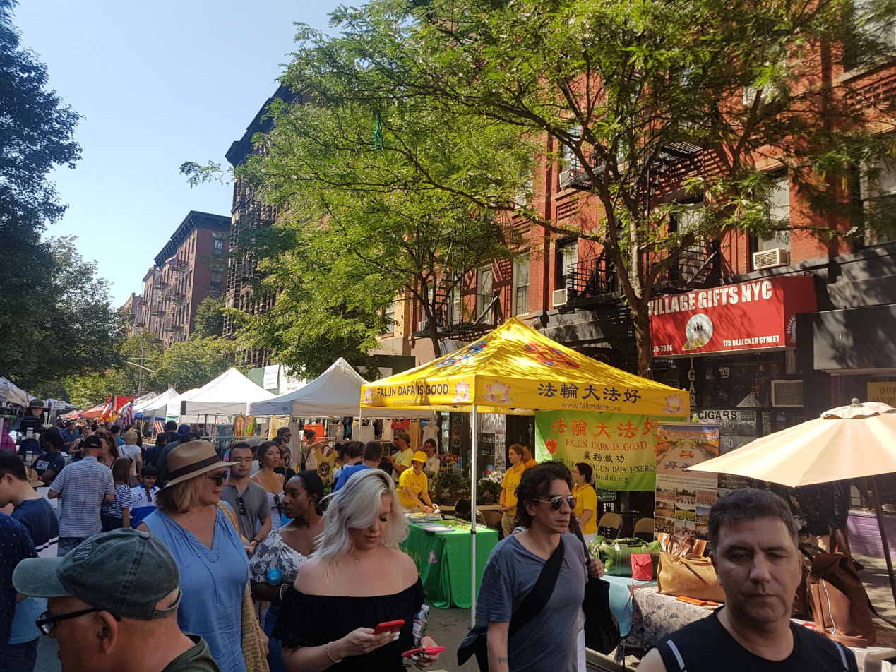 | 【明慧网二零一八年七月十日】一年一度的纽约曼哈顿街会(Street Festival)于二零一八年六月三十日、七月一日,以及七月七日,分别在曼哈顿下城纽约大学附近布利克街(Bleecker St)、拉法叶街(Lafayette St)与曼哈顿第八大道西中城(Midtown West)热闹登场。 街会从上午十点至下午六点,每一场次都设有数百个展位,延伸十五至二十个街区,众多的当地民众和游客前来游览、购物。法轮功团体作为社区组织也设立了展位,向各界民众传播法轮大法的美好。学员优美的功法展示,吸引各个族裔的民众驻足观看,一些西人当场学炼功法动作。  图1:在熙熙攘攘的曼哈顿街会中,法轮大法的展位远远就可见到。 |