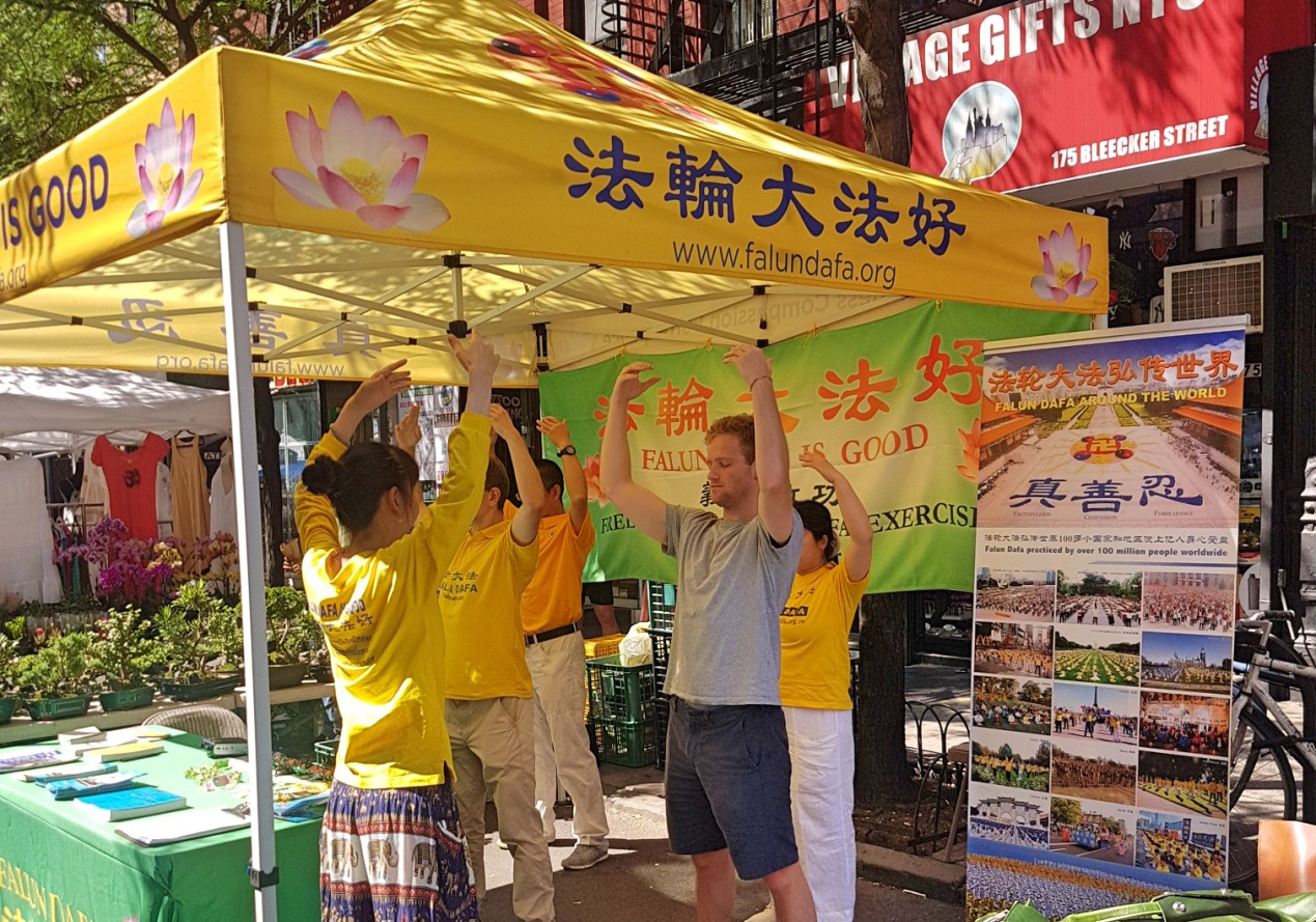 蒂姆(Tim)是一位西班牙的飞行员,他说每次来纽约他都喜欢来街会。他对法轮功学员说:“我远远地就看到了金色的法轮功的展位,很显眼,我就奔过来了。”他说:“看见你们很亲切,因为我的女朋友是炼法轮功的。” 法轮功学员问蒂姆自己有没有炼?蒂姆说自己很忙,只是偶尔与女朋友炼炼动作。学员告诉他:“看《转法轮》书更主要,书会具体地告诉你如何修心;如何修去人中名利欲望;如何去除恶念纯净自己。这本书已经翻译成三十九种语言,各个族裔的人们都是越看越喜欢看下去。因为这部书在一步一步地告诉你如何做一个好人,做一个超越常人、返本归真的修炼人。” 蒂姆认真听着,不住点头,说:“噢,我明白了为什么我的女友经常劝我看书看书,谢谢你告诉我这个意义,我明天飞回西班牙,开始看《转法轮》。” 法轮功展位旁边是一个印尼女孩子的小首饰摊位,印尼女孩子不时地看到西人来谘询法轮功,她也向学员讨要学炼的网站,想让体弱多病的妈妈学炼法轮功,希望妈妈强健起来,她记下了“法轮大法网站”(www.falundafa.org)。 有三位西人青年女孩子来到法轮功展位,看到展位上的真相图片,了解到了法轮功原来洪传世界七十八个国家地区,其中一位眼睛大大的女孩子说:“这么多的人(炼),我想学到哪里去学呢?”法轮功学员告诉她天梯书店每个月都有免费教功活动,七月九日就有一个新班开课。 她高兴地说:“今天是我的生日,我似乎得到了一份特殊的礼物。”三位姑娘与法轮功学员互通了脸书(facebook),最后,还接过学员送的象征着吉祥如意、印有英文“法轮大法好”的小莲花。 |