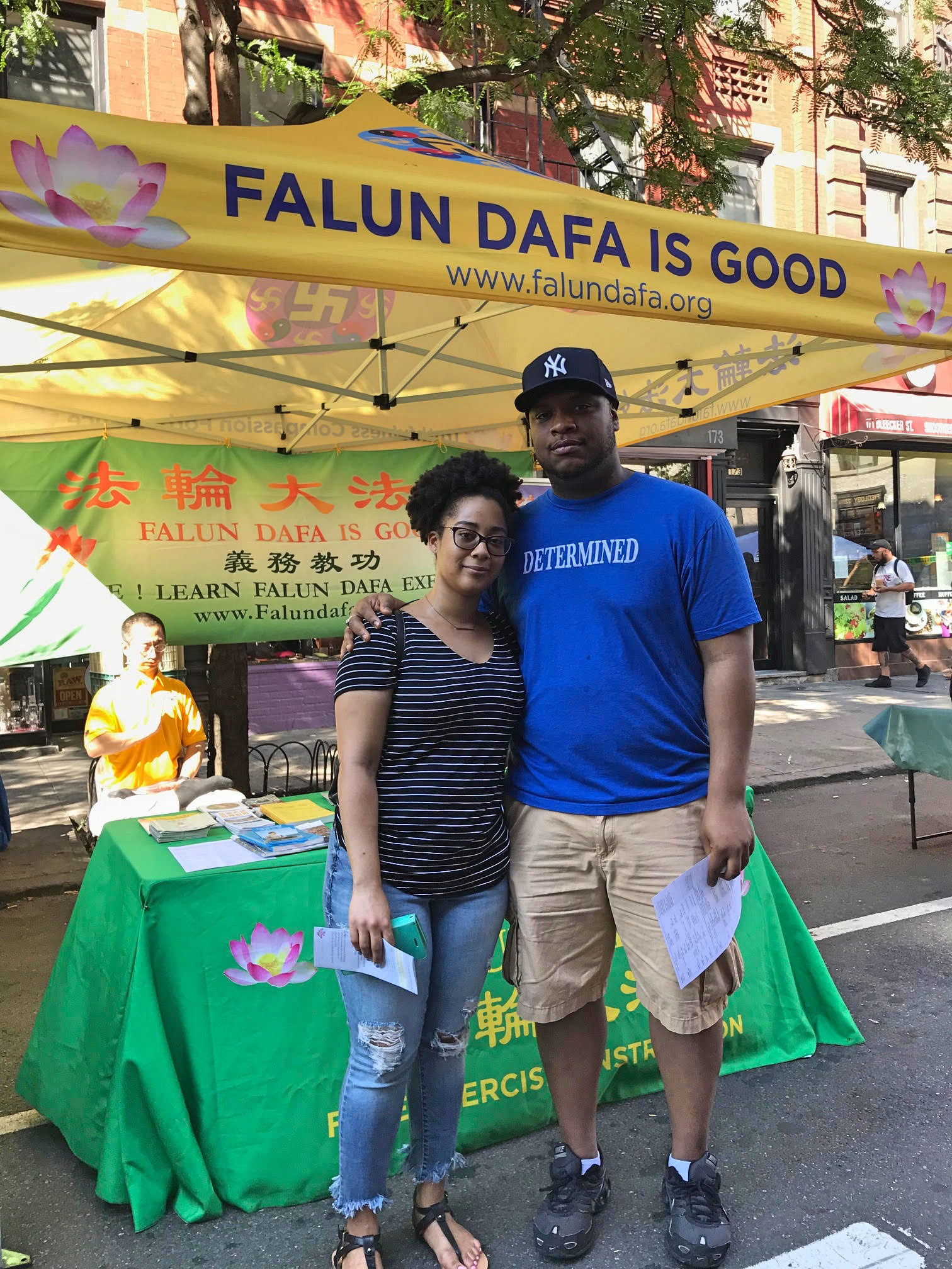 一对年轻情侣来到展位前,其中的男士拉希德(Rasheed)对学员说:“我在北部的斯基德莫尔学院(Skidmore College)念大学时,学习过中文,听老师讲法轮功在中国正在遭受着严重迫害,但我最早听到你们被迫害还是在我读高中时,那时在布碌仑。”他问学员“法轮功是什么?”学员告诉他:法轮功是一门传统的修炼功法,基于真、善、忍的原则要求自己,这门功法在看书实修与炼功过程中,人能体会到身心越来越健康。与学员继续攀谈一会儿后,两位情侣高兴地在法轮大法的展位前拍照留念才离去。 一位西人埃林(Ellyn)来自加拿大,之前她炼过半年的法轮功,但是没有正式学法轮功主要著作《转法轮》。她表示,来美国以后,她发现这里很多人都是修大法的,每次碰到,都令她感到这似乎是提醒要坚持炼下去。  图4:来自西班牙的蒂姆(Tim)说:“看见你们(法轮功)很亲切。” |