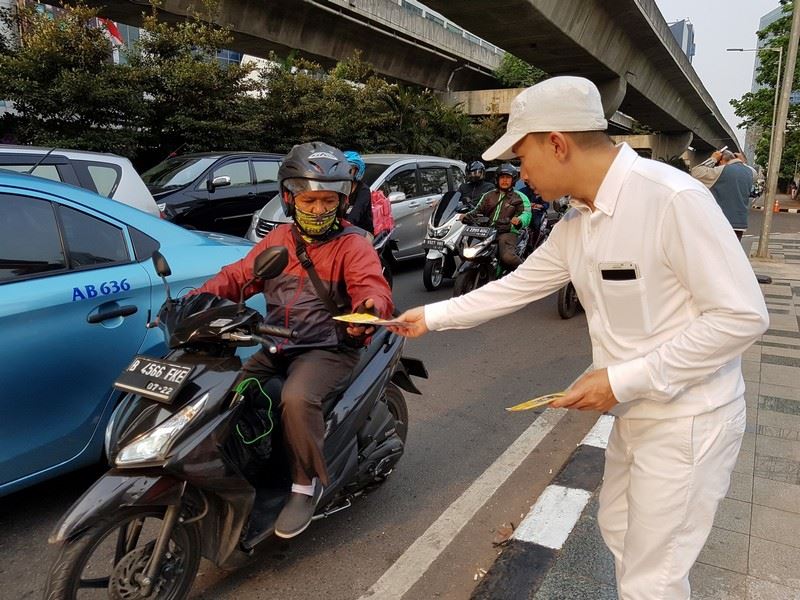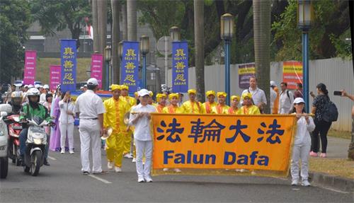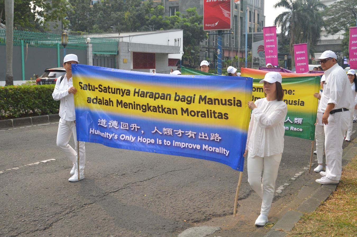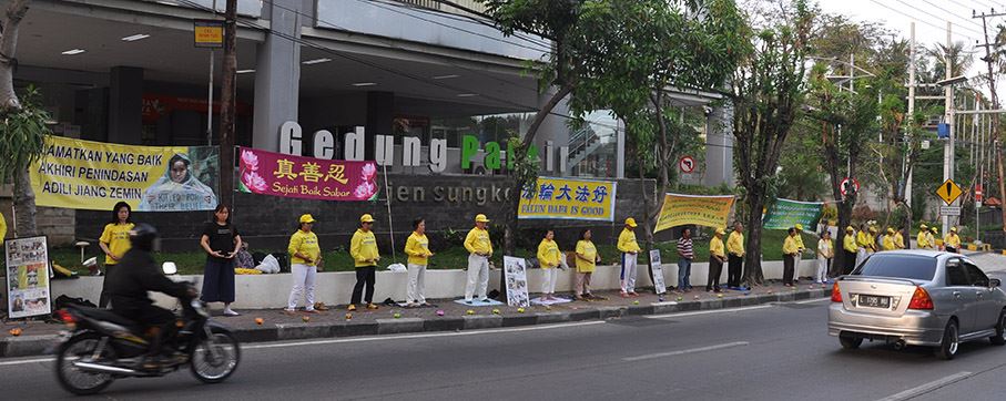 | 【明慧网二零一八年七月二十四日】二零一八年七月二十一日星期六,印度尼西亚雅加达及泗水市部份法轮功学员聚集在中国驻雅加达大使馆及中国驻泗水总领事馆前,举行游行及烛光夜,悼念被迫害致死的大陆法轮功学员,揭露中共的残酷暴行。 一九九九年“七·二零”,自从中共开始迫害法轮功至今已有十九周年,被迫害致死的大陆法轮功学员人数也一直在增加。这违反国际人权的暴行实际上已不能再容忍了,世人应该要一直关注着在中国发生的残酷迫害,共同制止对大陆法轮功学员的迫害。 雅加达游行及烛光悼念 印度尼西亚首都雅加达的活动在下午两点整开始,以和平方式在大使馆前展开真相横幅。接着在三点时开始排着游行队伍,围绕嚜嘎·古宁安(Mega Kuningan)这区域走了一圈,最后在大使馆前结束游行。  图1~2:法轮功学员围绕嚜嘎·古宁安(Mega Kuningan)区,最后在大使馆前结束游行。 |