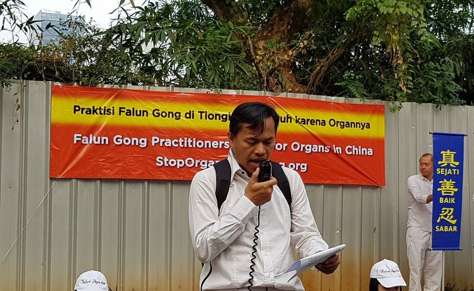游行是由腰鼓队领队,接着是反迫害横幅、中共活体摘取法轮功学员器官的行动剧的队伍等,吸引了不少都市人的目光。很多过往坐在车上的人也纷纷降低车速看着表演,并拿了法轮功学员发的真相传单及自制莲花。游行结束后,雅加达法轮功学员在大使馆前和平地展开了反迫害横幅。 记者会时,印度尼西亚法轮大法佛学会的发言人表示,至今迫害还在持续着,印度尼西亚法轮功学员声明为大陆同修的正义而持续坚定的给予支持,并公开揭露中共的所有罪行,及恢复法轮功的声誉,直到迫害停止为止。  图3:印度尼西亚法轮大法佛学会的发言人发言 |