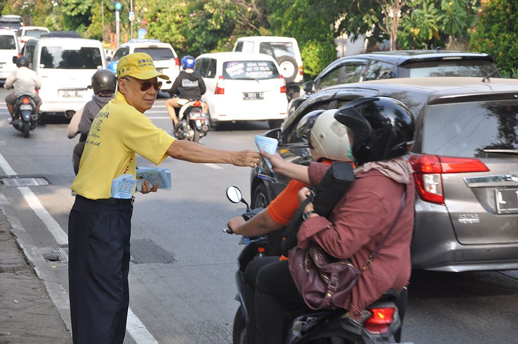 泗水市举办反迫害活动 和平的活动在下午三点三十分总领事馆前开始。泗水市部份法轮功学员在路边展开反迫害横幅,告诉人民法轮功的美好及中共的邪恶,发送法轮功资料传单给过往的人们,呼吁每个善良的世人能够共同制止残酷的迫害。 雅加达及泗水市的最后活动,法轮功学员们身穿一袭白色衣裤点燃烛光,烛光中静静的悼念被中共迫害致死的大陆同修。  图6~7:泗水市部份法轮功学员在路边展开反迫害横幅并发送真相资料 |