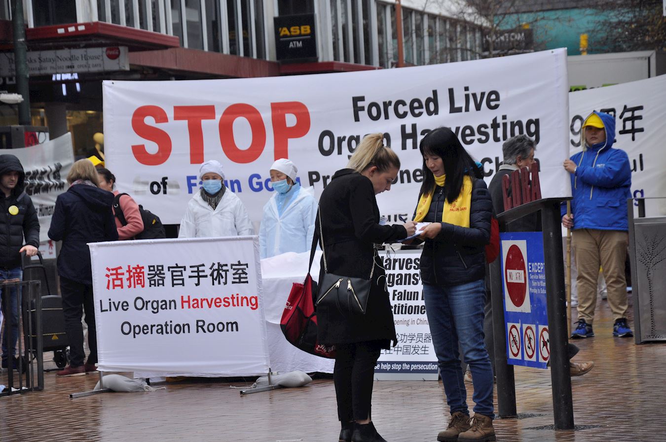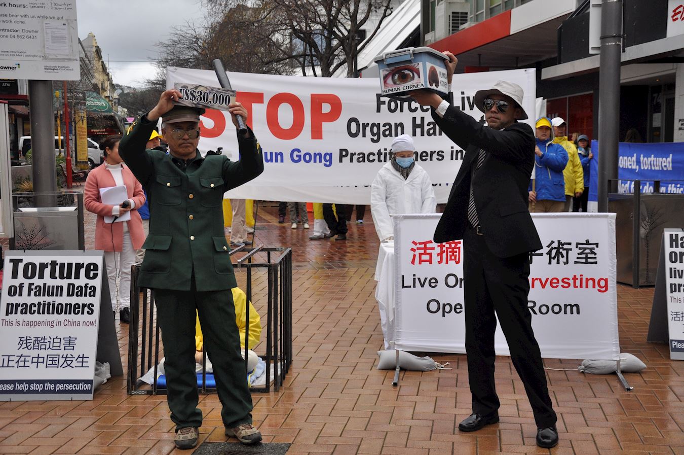 图2:威灵顿古巴街上,法轮功学员揭露迫害的酷刑展和活摘贩卖人体器官的模拟演示帮助人们了解迫害的残酷。 |