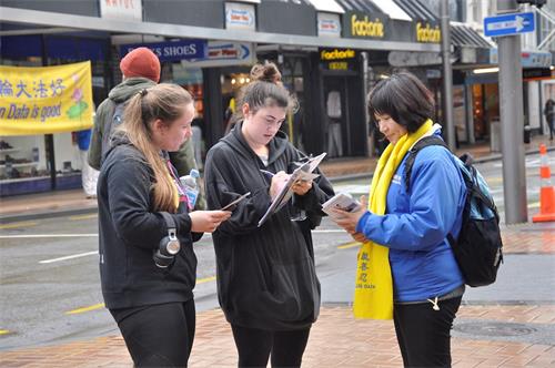 在国会门前集会的同时,威灵顿最繁华的古巴街上,法轮功学员揭露中共迫害的酷刑展和活摘贩卖人体器官的模拟演示让人们震惊于迫害的残酷。不少行人听到真相后,对中共的暴行非常愤慨。  图5:安德鲁·若森希望更多的人来签名支持法轮功。 |