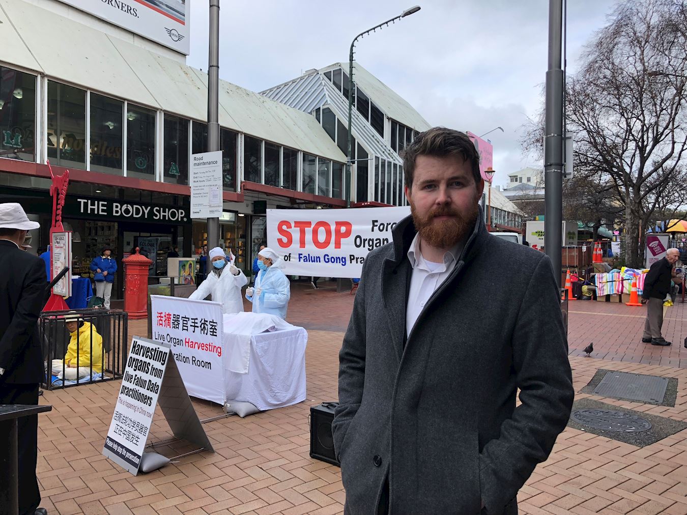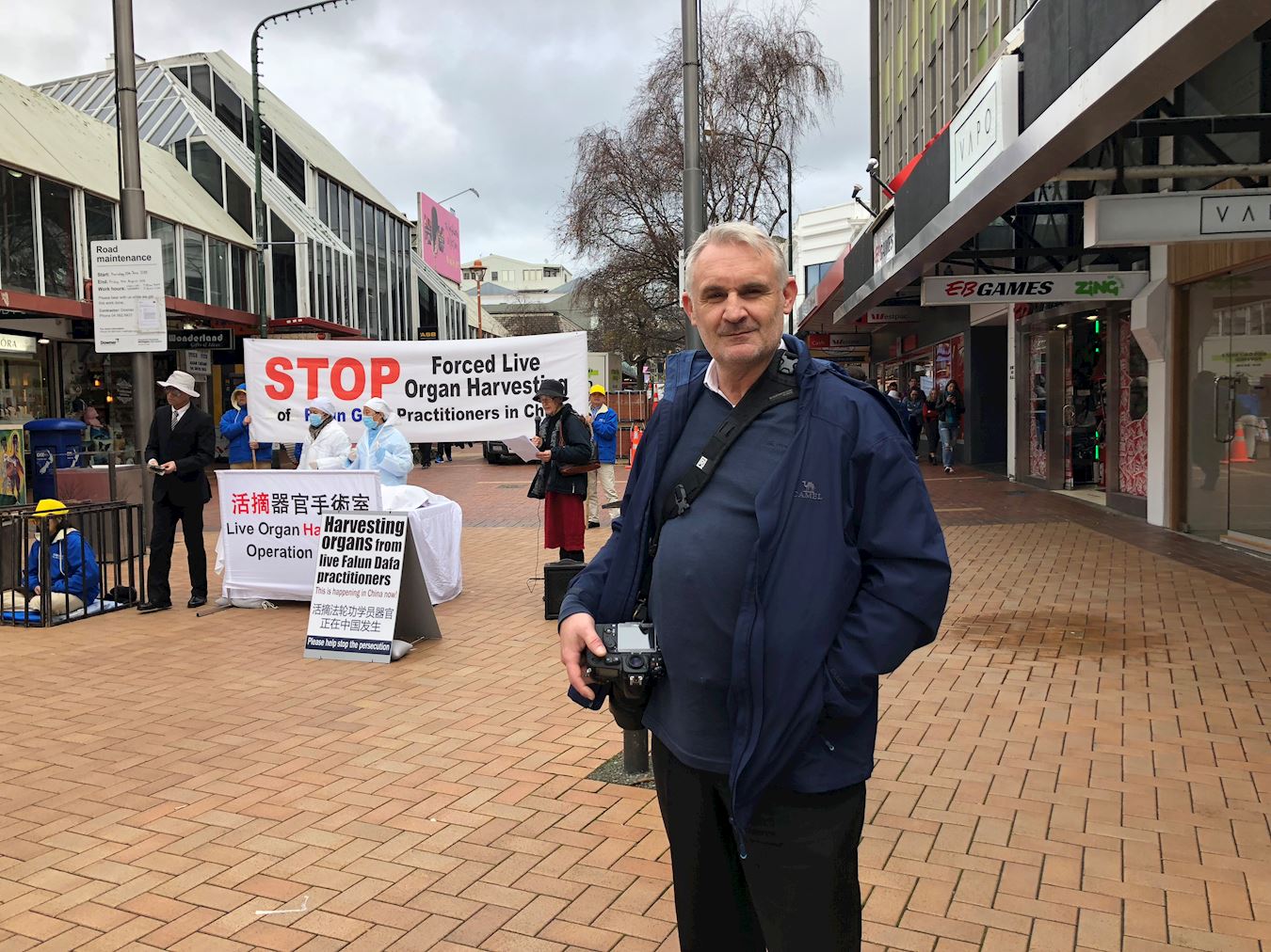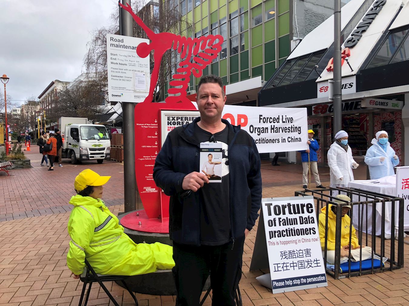 本·李(Ben Lea)在一家酒店工作,他在大学的时候曾经在威灵顿中使馆附近居住,见到过法轮功学员在使馆门前的抗议。他不敢相信这个迫害已经持续十九年了,他感叹地说,该有人站出来做点什么了。活摘人体器官真的太恐怖,新西兰政府应该站出来谴责(中共)这一暴行。他赞扬法轮功学员的讲真相很好,让成千上万的人知道了中国正在发生的事。  图7:大卫说共产党一定要倒台的。 |