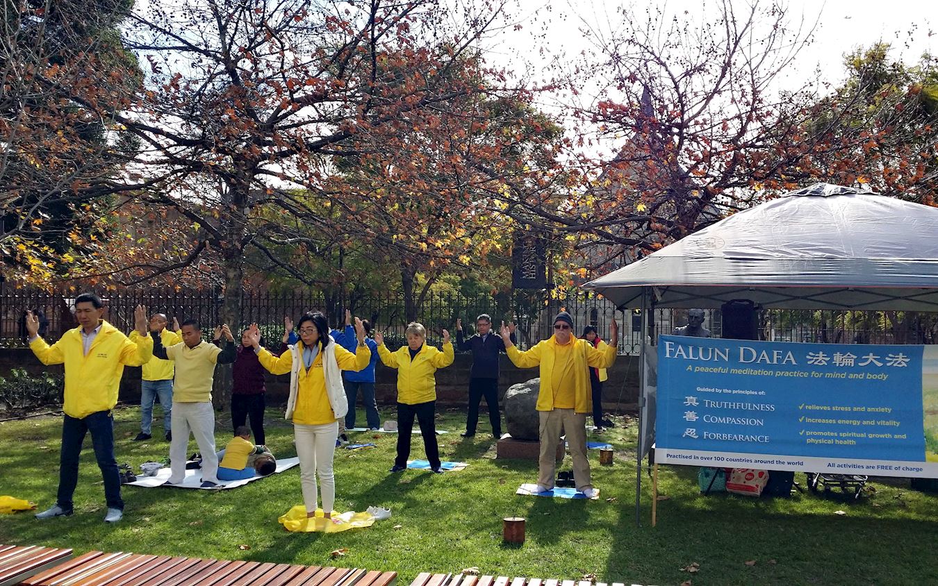 | 【明慧网二零一八年七月二十六日】二零一八年七月二十一日周六上午,澳洲南部阿德雷德市的部份法轮功学员在市中心举办炼功、讲真相活动,呼吁国际社会制止中共对法轮功长达十九年的残酷迫害。 这是本地学员首次选择该地点举办活动,这里位于繁忙的文化商业街北大街(north terrace),一侧是州立图书馆、美术馆、博物馆和阿德莱德大学,另一侧通本地最热闹的商业购物街,过往行人、车辆川流不息。 法轮功学员表示,希望通过活动,分享法轮大法的美好,揭露迫害的邪恶,呼吁制止迫害、法办迫害元凶江泽民,呼唤人们在善与恶之间作出正确选择。 一九九二年法轮功自中国大陆传出,迅速使上亿修炼者身心受益。如今已弘传到全球一百多个国家和地区。但是中共江泽民集团自九九年七月二十日开始,对法轮功修炼人进行残酷镇压,到现在十九年了,迫害还在进行。  图1~2:南澳法轮功学员在市中心集体炼功,传真相 |