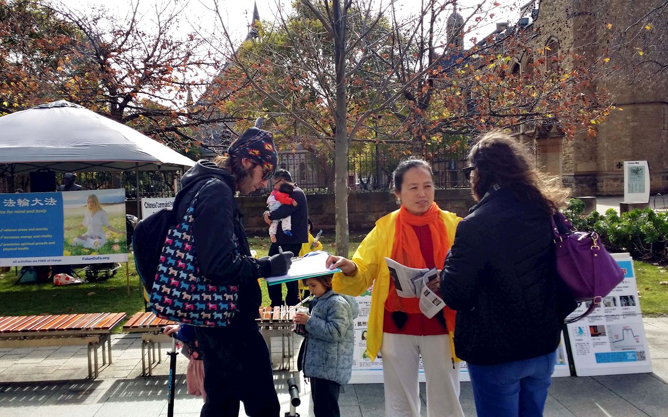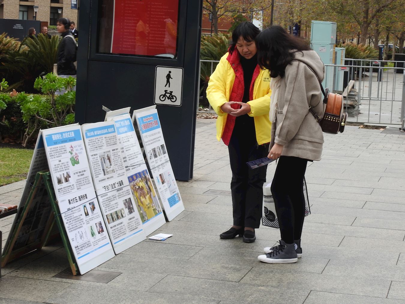 排列在阿德莱德大学正门外的展板吸引了一些中国学生停住脚步,主动来听学员给他们讲法轮大法的美好、天安门自焚是中共制造的骗局、迫害元凶江泽民在全球范围(包括中国大陆)被起诉、有三亿多人退出中共相关组织等真相。 女学生安可(化名)刚从中国来澳洲几个月,她很用心地听法轮功学员讲解,特别是听闻学员给她讲自焚的慢镜头分析,告诉她自焚是中共一手编制的骗局,她感到很震惊,因在国内讯息被封锁,无从知晓,听到看到的都是中共一言堂的谎言。她当即表示愿意用安可的化名退出中共,抹去毒誓。 法轮功学员章先生说,中共用谎言加暴力残酷迫害法轮功十九年,甚至大量活摘法轮功学员器官,还通过使领馆,将迫害延伸到国外。中共还输出其意识形态,操控留学生和海外华人,渗透西方自由社会。然而,自古邪不压正,法轮功不但没有被打压下去,反而洪传全世界一百多个国家和地区。中共江泽民集团迫害法轮功,诋毁“真、善、忍”普世价值,彻底暴露出其妄图毁灭人类的邪恶本性。现在全世界都在揭露和抵制它。澳洲最近还立新法对付中共渗透。历史巨变就在眼前。 他呼吁更多中国同胞赶快声明退出曾经加入过的中共党、团、队组织,远离邪恶,保平安。目前已有三亿九百多万中国人声明三:退.(退!党!、团、队),他们在善与恶之间作出了明智的选择,从而使生命有了一个美好的未来。