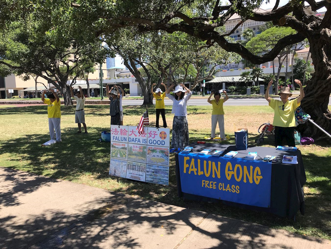 【明慧网二零一八年七月六日】二零一八年七月四日,夏威夷檀香山法轮功学员来到“阿拉莫阿那海滩公园”举办一年一度的美国国庆日弘法讲真相活动。民众对法轮功学员传播的真、善、忍的大法法理表示喜爱,还有多位华人现场退出了曾经加入过的中共党、团、队组织。 图:学员在活动现场演示法轮功五套功法 |