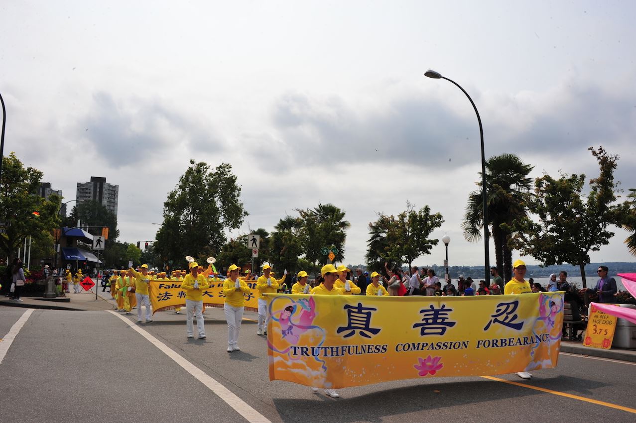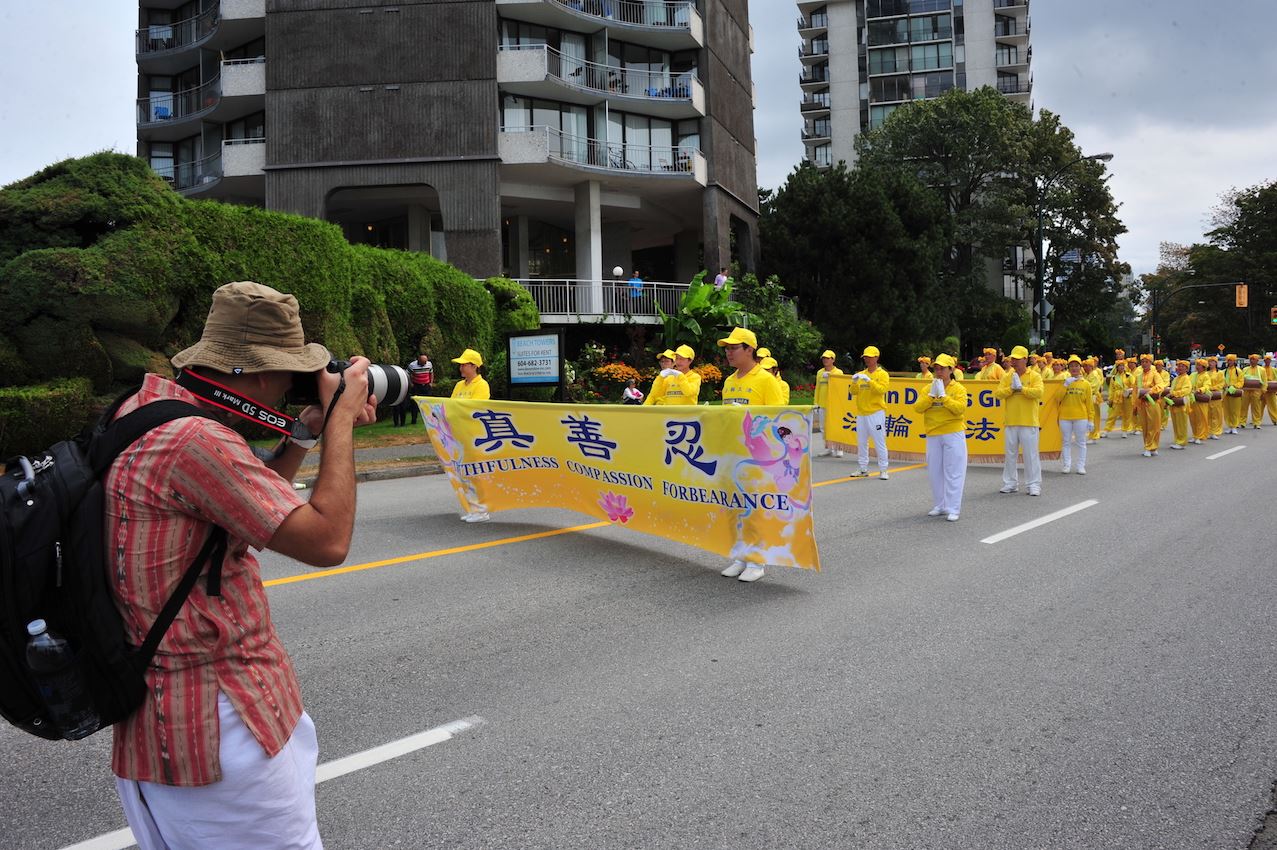 图2~4:温哥华部份法轮功学员参加了在温哥华市中心海滨大道举行的游行受到民众欢迎。 |