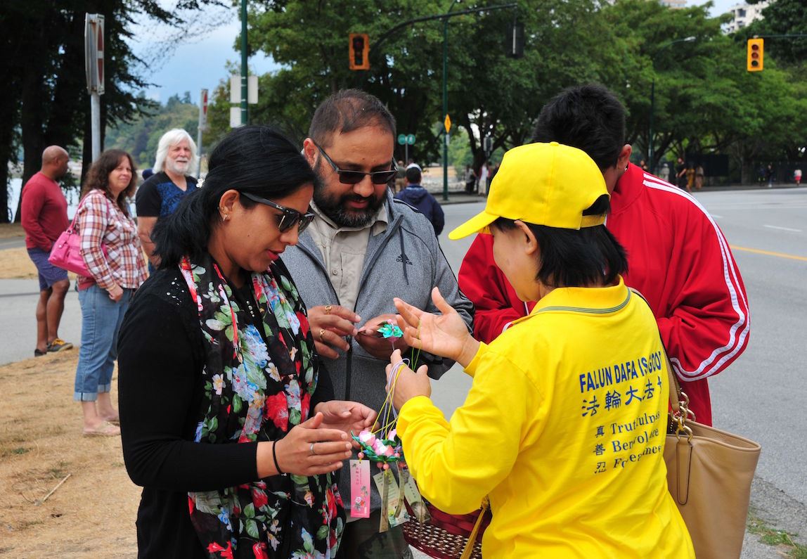 从事金融业的东条先生是日裔加拿大人,他将“法轮大法好”书签小心地收藏好后表示:“法轮功学员没有做任何对别人不利的事情,只是想炼功健身,却受到中共政府的无辜迫害,这是错误的。法轮功学员的团队很祥和,中国和日本有很多传统的文化很相通,可惜的是这些传统在中国被破坏掉了,我很高兴在温哥华可以看到这么多的中国人在修炼法轮功,保留着传统的信仰,这很好。” 伊娃·马丁尼(Eva Martiny)女士是住在温哥华市中心游行路线附近的居民,因为天气好,在海边散步,她是第一次看到法轮功学员的游行,她在路边兴奋地应和着腰鼓队的节奏向法轮功学员举手欢呼。她表示,“我是第一次看到法轮功,我觉得他们很好,我很喜欢他们的表演,特别是那个打鼓的队伍,我能感受到这是传统的表演,有历史文化的内涵,我很兴奋,很喜欢。” 一位来自中国大陆的华人男士,高兴地在路边与法轮功学员一起喊:法轮大法! 并表示他知道法轮功学员在全球起诉迫害元凶江泽民,并呼吁全球审判江泽民,他表示在中国大陆江泽民很快就会被抛出来,起诉江泽民会从中国大陆开始。