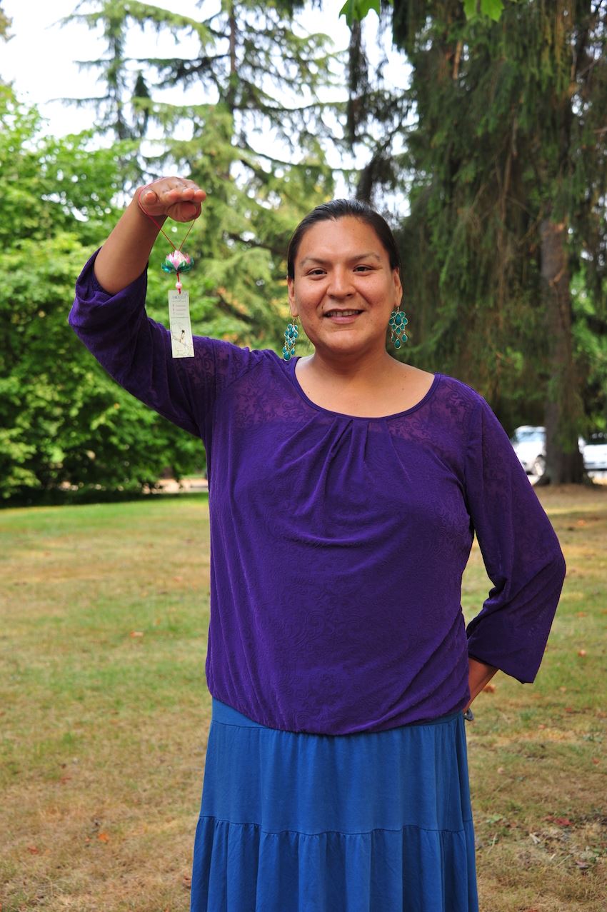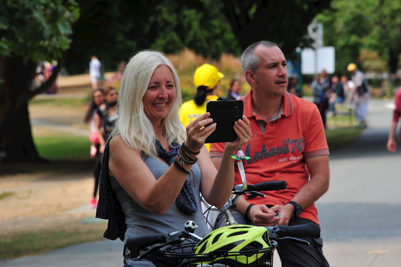 还有一群来自阿拉斯加的游客举着“法轮大法好”书签表示,她们从游艇上下来到市中心随意走走,意外遇到游行的法轮功学员,还收到精美的礼物,真是意外惊喜。 西德尼·凯利(Sidney Kelly)女士是住在温哥华市中心的居民,因为天气好,所以与家人一起在史丹利公园乘凉,正好遇上游行的法轮功团队,她在路边兴奋地反复向法轮功学员挥手致意,她表示:“我是第一次看到法轮功学员的游行,我最喜欢的颜色就是黄色,我非常喜欢法轮功学员们金黄的服饰,我很感谢法轮功学员们与大家分享他们修炼的功法,很祥和美好。”她举起手中的“法轮大法好”书签反复地说“法轮大法好”,并与记者确认她的发音是否正确。 她说:“我太喜欢了,太美了,我回家后会找更多的法轮大法资料来阅读。” 她对精美的书签赞不绝口,她赞叹:“真善忍,法轮大法好,真是太美了,我太喜欢了。”  图9:西德尼·凯利喜欢法轮大法 |