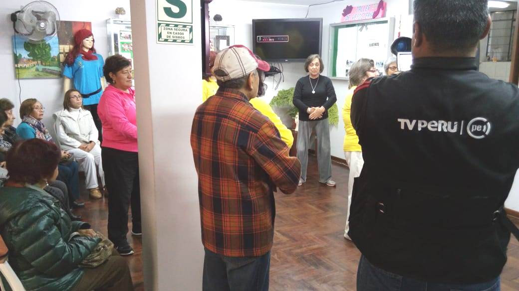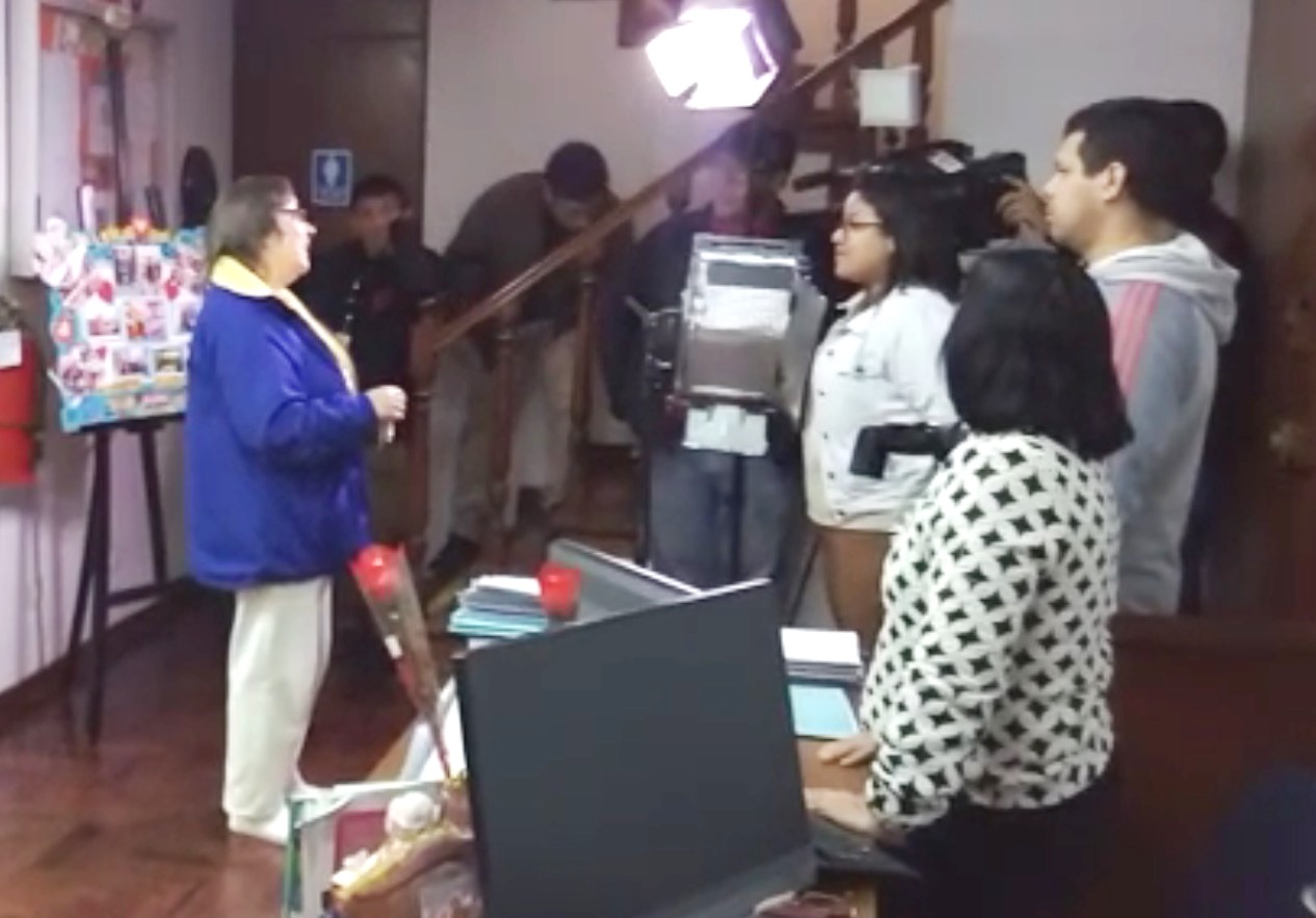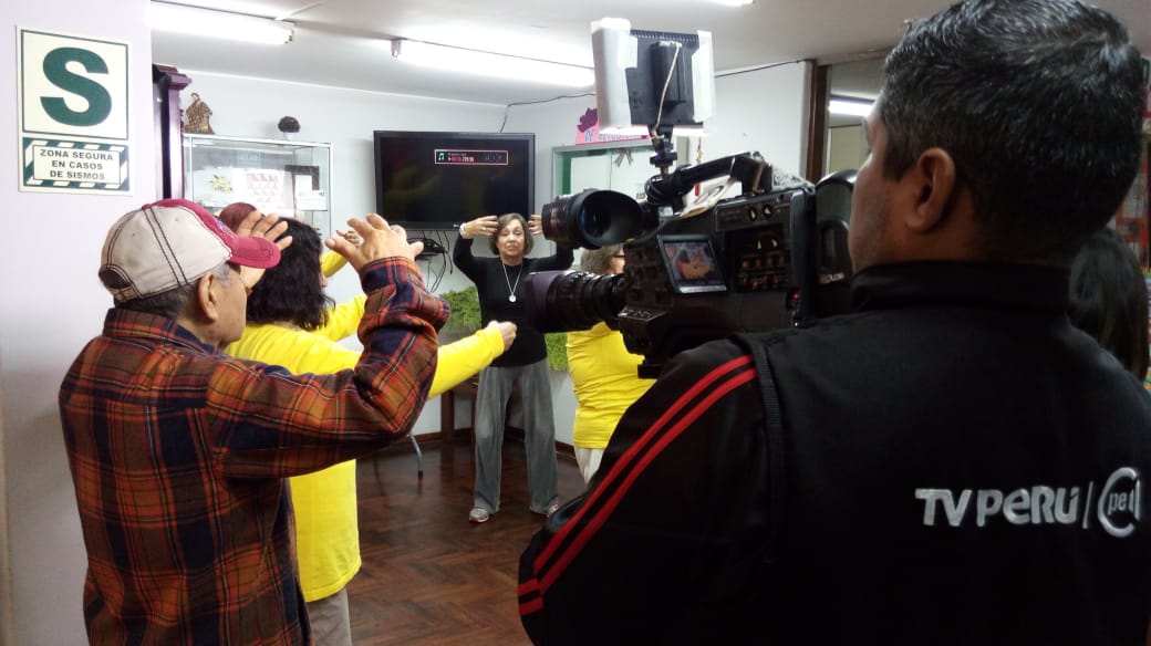 | 【明慧网二零一八年八月十七日】二零一八年八月十日上午,秘鲁法轮功学员应利马市圣·博尔哈(San Borja)区政府的邀请,在辖区之下的“老人之家”(CIMA)为民众教授法轮功五套功法,秘鲁国家电视台专呈前来采访,他们把学员们展示的五套功法及悠扬的乐声一一摄入镜头,还采访了法轮功学员露易莎(Luisa),她向记者介绍什么是法轮大法,在学习“真、善、忍”做好人、提高道德的同时炼五套功法,以达到祛病健身的功效。 露易莎并介绍:一个多月前,受区政府的邀请开始每周一次在“老人之家”(CIMA)为民众教授法轮功,这一简单易学驱病健身的好功法获得热烈反响,要求学功的人不断增加。区政府的工作人员看到大家在炼功之后很短的时间里身心发生的明显变化,都感到很惊讶,为了让更多的人了解功法,于是把学炼法轮功列为社区活动范围的日程。  图1:秘鲁国家电视台正在采访法轮功学员露易莎(Luisa) |