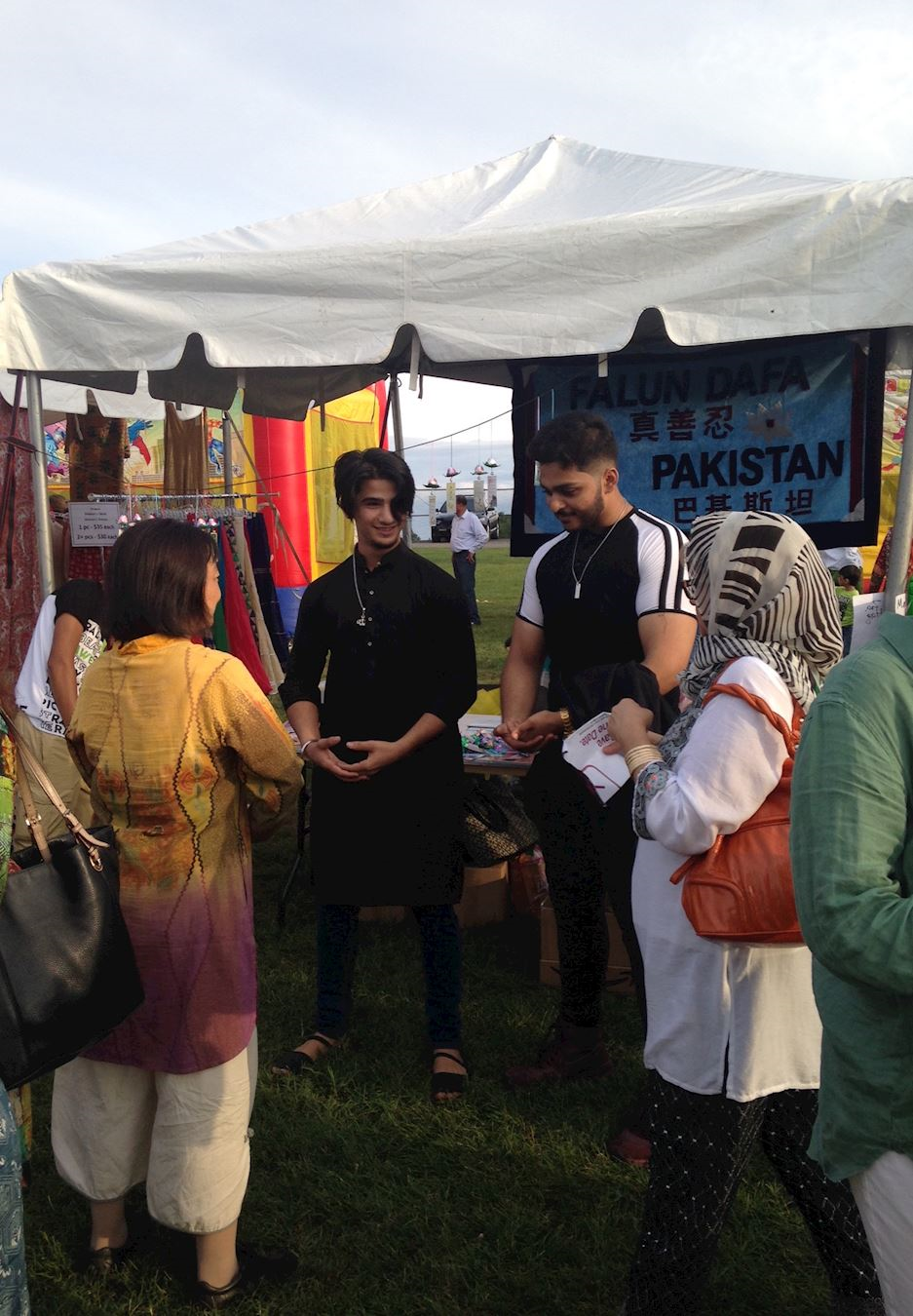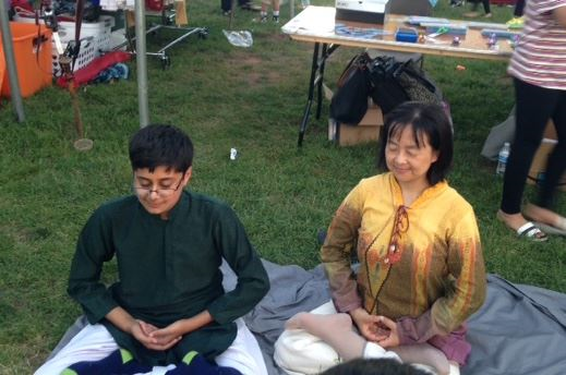 | 【明慧网二零一八年八月二十四日】二零一八年八月十四日是巴基斯坦独立节,八月十八日北维州(Northern Virginia)地区的法轮功学员参加了在当地公园举办的巴基斯坦独立节活动活动(Pakistan Festival),并摆放真相摊位,举办炼功和讲真相活动。学员炼功时,吸引了很多民众的注意,学员周围总是围着不少人观看,学员于是邀请民众加入炼功,一起试试,很多人加入了学功并且很感兴趣。 有的人跟着学员炼了很长时间,家人来催促好几次才依依不舍的离开;一位女士学炼了一会儿以后马上表示要到周六的炼功点接着学;还有一个七岁的小姑娘也跟着学员开始打坐,学员还教了她“真善忍”三个汉字。不一会儿,她又带回一个五岁的小男孩,也想要学员折叠的纸莲花,学员又带他重复了一次炼功及念“真善忍”。不多久,她又带来另一位小男孩,这次孩子们的母亲也来了,母亲在一边静静地看着学员教她的孩子们炼打坐、念“真善忍”,给了莲花后,孩子们临走前笑得好开心。  图1~3:法轮功学员在教功,很多年轻人驻足认真学炼 |