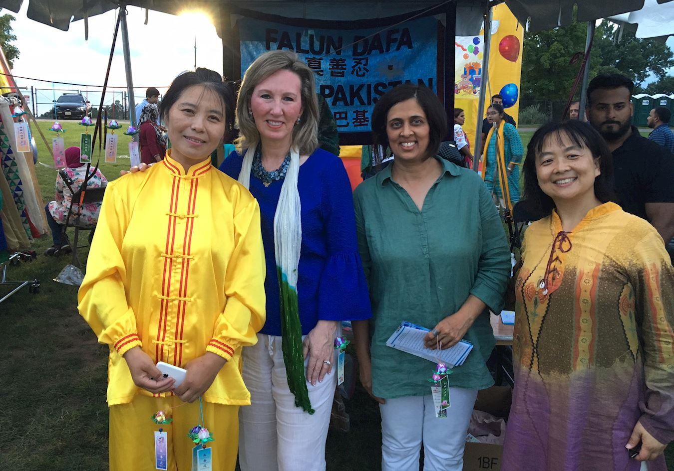 过往的很多巴基斯坦裔民众被学员们祥和的炼功场景吸引,围着停了下来。这时发资料的学员就走上前去递上法轮功真相传单;有的人自己到桌子上拿走真相传单。 这次活动也邀请了当地官员参加。维州的国会众议员芭芭拉·简·康斯托克(Barbara Jean Comstock)女士也来到学员的真相摊位并和学员们一起合影,并且表示会继续支持法轮功反(中共)迫害,也会一如既往的参加学员举办的新年庆祝活动。  图4:维州国会众议员芭芭拉·简·康斯托克(左二)和学员们合影留念 |