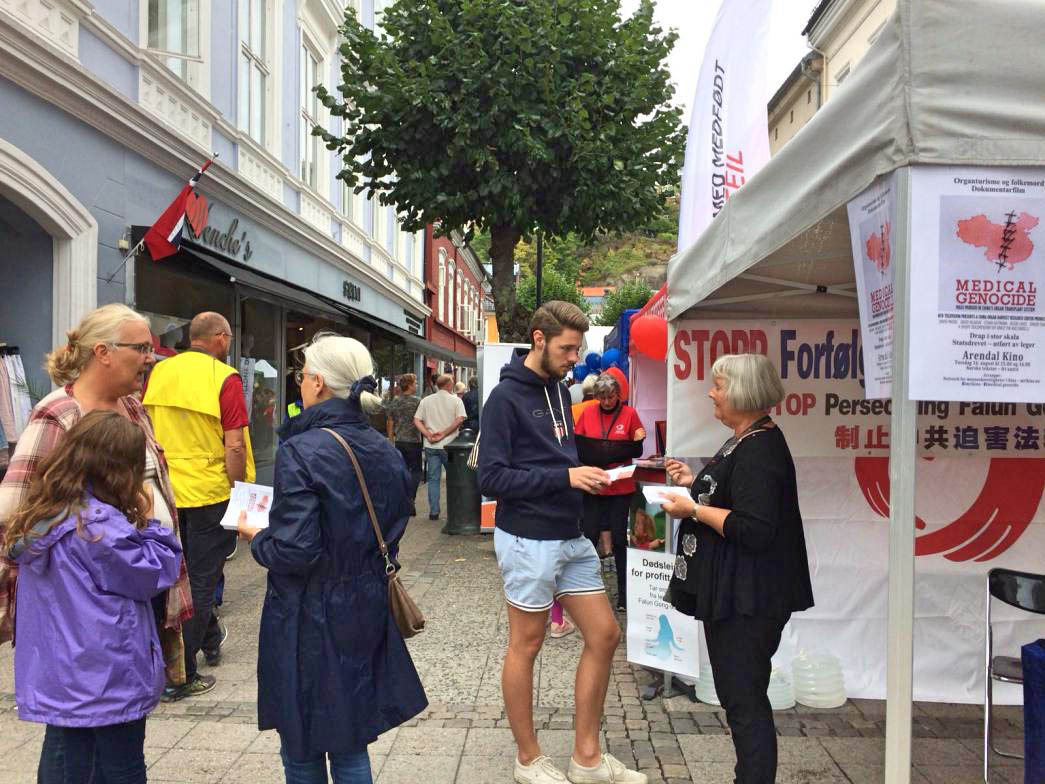 | 【明慧网二零一八年八月二十五日】阿伦达尔政治周(挪威语Arendalsuka),是每年夏末秋初在挪威南部城市阿伦达尔举办的挪威政治节日。每年的活动都吸引了挪威各大政党、政府机构、慈善组织、政治家,专业人士等各方政治要人参加。 今年的阿伦达尔政治周活动于二零一八年八月十三日至十八日举行。法轮功学员也来到这里摆设展位,传播法轮大法的真相。  图1~3:二零一八年八月十三日至十八日,法轮功学员在阿伦达尔政治周活动中设立真相展位,向前来参加活动的民众传播法轮功的真相。许多民众驻足于学员攀谈,了解真相。 |
