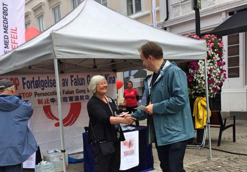 今年是法轮功学员第四年来参加这个活动。八月十四日,法轮功学员在真相展位上挂出“制止中共迫害法轮功”的条幅,醒目的横幅吸引了不少前来参加政治周活动的人们的目光。学员们与他们攀谈,给他们讲诉法轮功在中国大陆遭受迫害的事实,并邀请他们八月十六日到电影院观看揭露中共活摘器官这一罪恶的真相纪录片。 八月十六日,人们观看了揭露中共活摘罪恶的真相纪录片后,感到震撼,有的人不敢相信竟有这种残酷的事情发生;有的表示要努力帮助法轮功去做些什么;有的人想把看到的真相传播出去…… 来自挪威左翼政党的弗洛沃说:“我以前从来没有听说过中共活摘法轮功学员器官一事。我的工作是关于媒体与政治方面的,我会把这个消息公布到我们的官方网站上。” 善良的英格丽女士表示无法容忍中共的暴行,她激动地表示:“太可怕了,简直就是惨无人道。感谢你们来到这里告诉我们这些,我一定会把这个事情告诉我的亲朋好友! 我的儿子是一名外科医生,住在斯塔万格并在那里小有名气。我肯定会告诉他在中国发生的活摘人体器官的事情……” 谢斯迪先生说: “这简直太令人无法想象, 世界上竟然发生着这样残暴的事情,而且持续这么长的时间,而且是一个国家的政府在残杀他的人民……”“昨天和你们交谈后,我回去就上网了解法轮功。义务教功真是太好了。多年来我一直在寻找一种能够帮助我身体健康的方法,曾经有人向我介绍瑜伽,但是我总觉得那不是我要找的。今天遇到了你们,我想法轮功应该就是我要找的。”