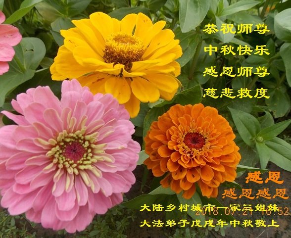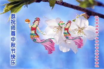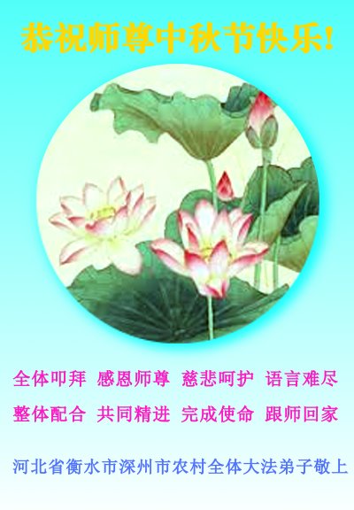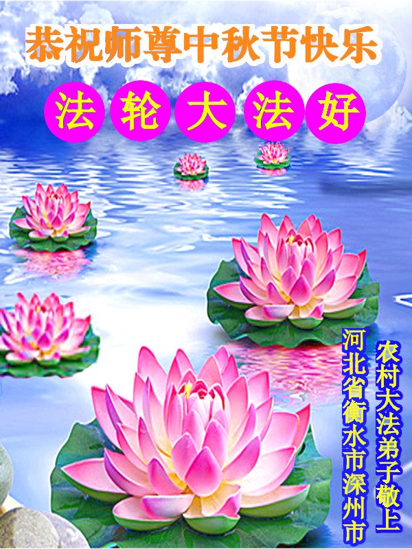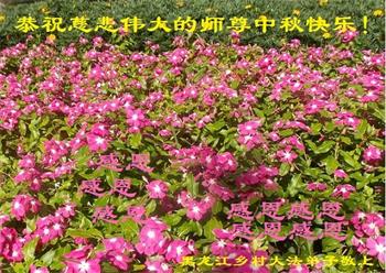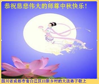 师父好!弟子一定珍惜师尊延长的修炼时间,好好修自己,做好三件事,跟师父回家。祝师尊中秋快乐! 海阳老年大法弟子 四川仁寿乡村全体大法弟子恭祝师尊中秋快乐!