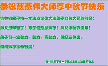 师尊为众弟子及众生操劳,辛苦了!感谢师尊的慈悲苦度!没有更好的语言能向师父表达感恩,我们只有坚信师父、坚信大法,修好自己,整体配合、整体升华,助师正法,救度众生,圆满随师父回家。弟子们向师尊致崇高敬意!感恩师父的慈悲苦度! 吉林省白城市一老年大法弟子恭祝师尊中秋节快乐!