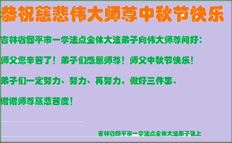 又是一年中秋节,弟子遥祝师尊节日快乐!弟子一定精進实修,做好三件事! 辽源市一家族大法弟子敬祝。 |