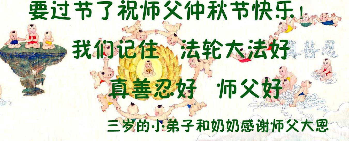 黑龙江哈尔滨大法弟子一家恭祝师尊中秋节快乐!弟子一定多学法,做好三件事。 小弟子一定提高心性,多学法,努力上飞天,助师正法,跟师父回家。 山东省济南市天桥区一大法弟子携大法小弟子恭祝师尊中秋节快乐!