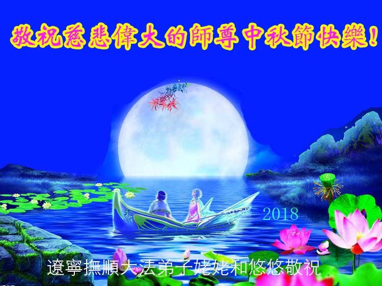 【明慧网二零一八年九月二十二日】 辽宁抚顺大法弟子祖孙二人敬祝慈悲伟大的师尊中秋快乐!