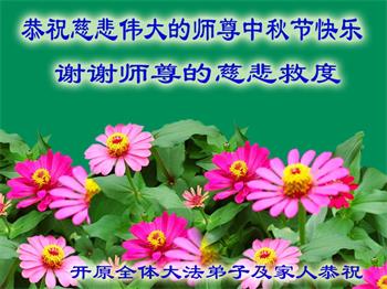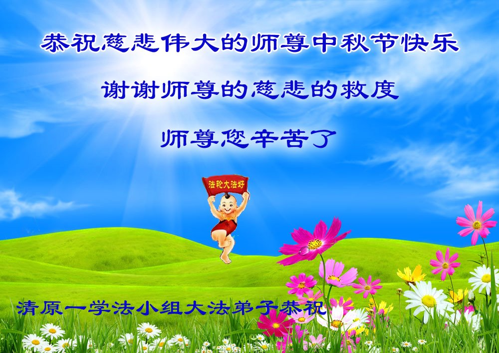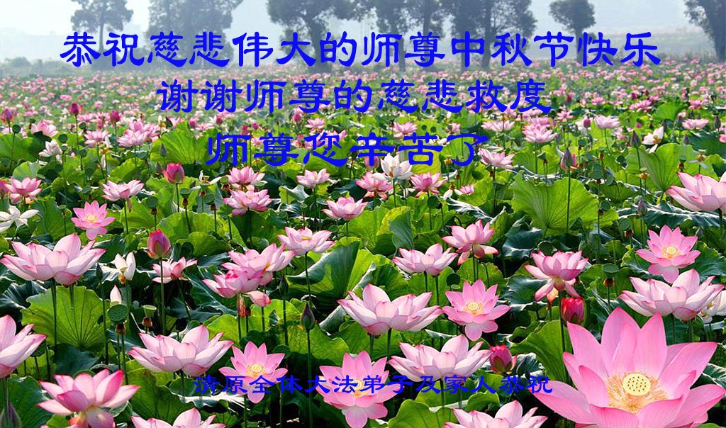 师父您好,您辛苦了! 正法進程進入最后的最后了,我们都知道是慈悲伟大的师尊用巨大承受给延续来的宝贵时间,虽然有很多困难,但是我们会克服的,不被眼前的形势所吓倒,我们没有失去信心,我们会坚定不移走好师父安排的助师正法之路,不断的学好法,向内找,做好三件事,协调配合好,共同跟上师父正法進程,我们时刻盼着伟大的师尊早日回到大陆,让我们以自己的实际行动来报答师尊的救度之洪恩!完成历史使命,兑现神圣誓约,我们一定珍惜这万古机缘。圆满随师还。 跪拜师尊!合十 辽宁省抚顺市清原县枸乃甸八名大法弟子恭祝师尊中秋节快乐!