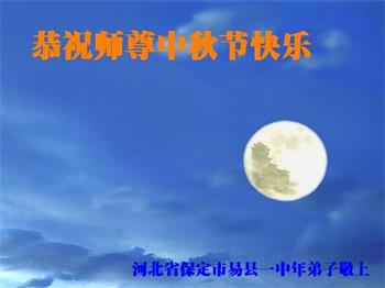 师父您好! 师父您辛苦了! 昨夜,黑云密布,电闪雷鸣,暴雨滂沱;今夜,天晴云静,月光皎洁,清风徐徐。一年又一年;一日又一日,大法弟子在伟大的师尊的慈悲加持和保护下从黑夜走向黎明。弟子感恩师尊的慈悲苦度!弟子深知,无论自己怎样做都不能报答师尊给予弟子的一切恩赐。在二零一八年中秋节即将来临之时,弟子跪拜师尊,纵有千言万语,汇成一句话:恭祝师尊中秋节快乐!弟子唯有学好法,真修实修,做好三件事,才不辜负师尊的慈悲苦度! 河北省保定市易县一中年大法弟子恭祝师尊中秋节快乐! 二零一八年九月十一日 河北省保定市易县一学法小组弟子恭祝师父中秋节快乐!
