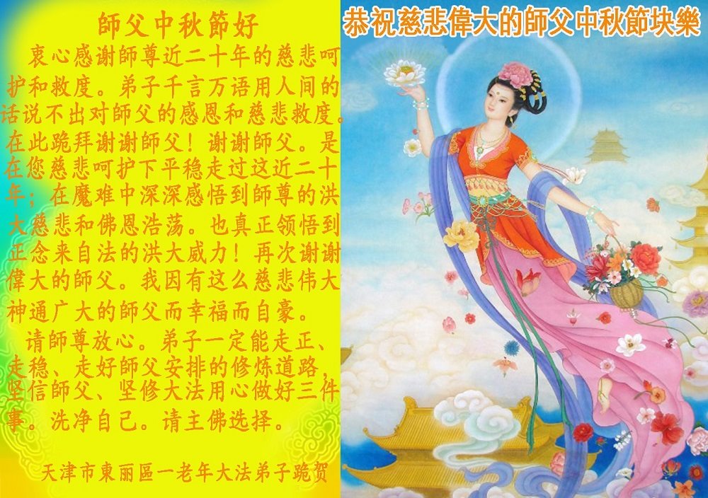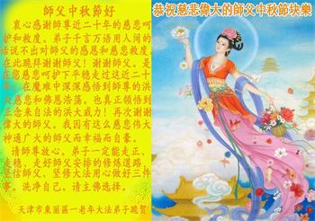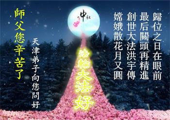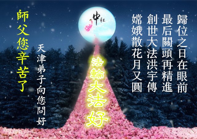 恩师您好!又一个中秋节到了,……好想您,感恩师尊!我们知道只有学好法,坚定正念,做好三件事,才能真正走出人,我们会做好的。 天津市大法弟子恭祝师父中秋快乐!