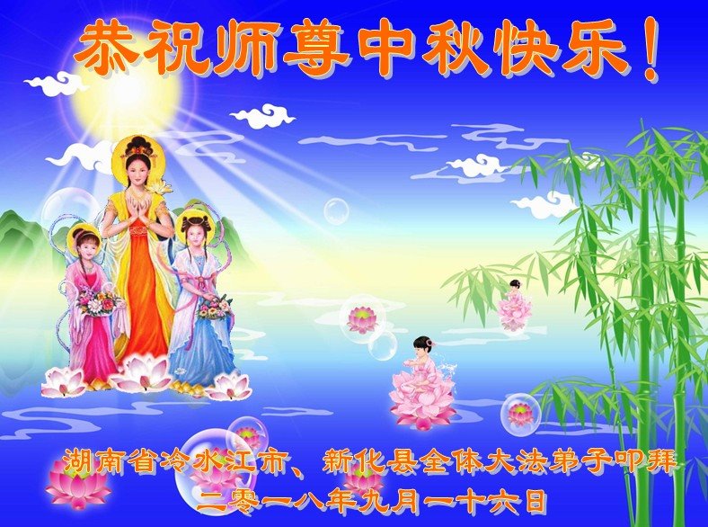湖南省娄底地区新化县全体大法弟子恭祝慈悲伟大的师尊中秋快乐! 二零一八年九月十六日 湖南省娄底地区冷水江市、新化县全体大法弟子恭祝慈悲伟大的师尊中秋快乐!