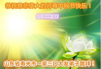 【明慧网二零一八年九月二十二日】 山东省潍坊市寿光市一家三口大法弟子恭祝慈悲伟大的师尊中秋节快乐!