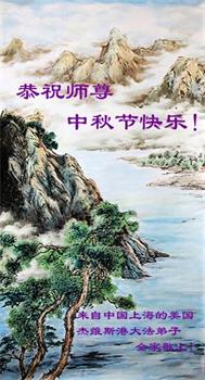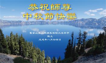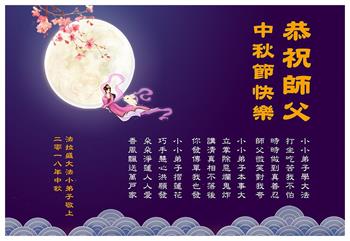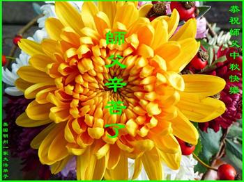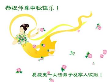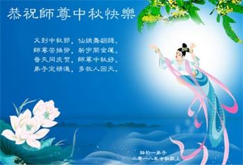 中秋佳节到来了,弟子恭贺师父佳节快乐!中秋是圆满的日子,弟子深深知道师父给予我们的法轮大法,能使我们修炼圆满。一些同修在大法中修炼勇猛精進,修成了,成为真正的大法徒,他们无愧师父的慈悲救度, 无愧于他们世界众生的期盼,他们的生命已经走向永恒。弟子惭愧,在目前师父的巨大承受下延长的修炼时间里,还不知道很珍惜,至今还有很多执着没有放下,没有修去,弟子希望能在今后的修炼中严格按法轮大法的要求去修炼,走向圆满。弟子无限感激师父的洪大慈悲救度之恩,在中秋佳节叩谢师父!,弟子给师父深深的敬合十礼! 纽约上州大法弟子恭祝师尊中秋快乐!
