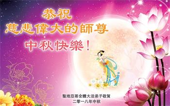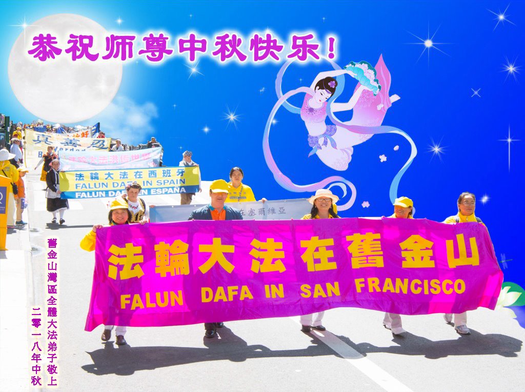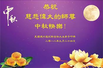 中秋佳节倍思亲 最亲亲人是师尊 弟子恭祝师尊好 节日快乐!永开心 中秋佳节忆师恩 洪愿正法是师尊 开创三界救众生 正天正地正人心 中秋佳节颂师恩 洪大慈悲是师尊 转动法轮传大法 苍穹辉煌万象新 中秋佳节谢师恩 洪大威德是师尊 除恶救众无量计 同化圆容真善忍 中秋佳节报师恩 洪恩浩荡是师尊 证实大法传真相 修炼救人永精進 2018年中秋节 美国旧金山湾区全体大法弟子恭祝师尊中秋节快乐!