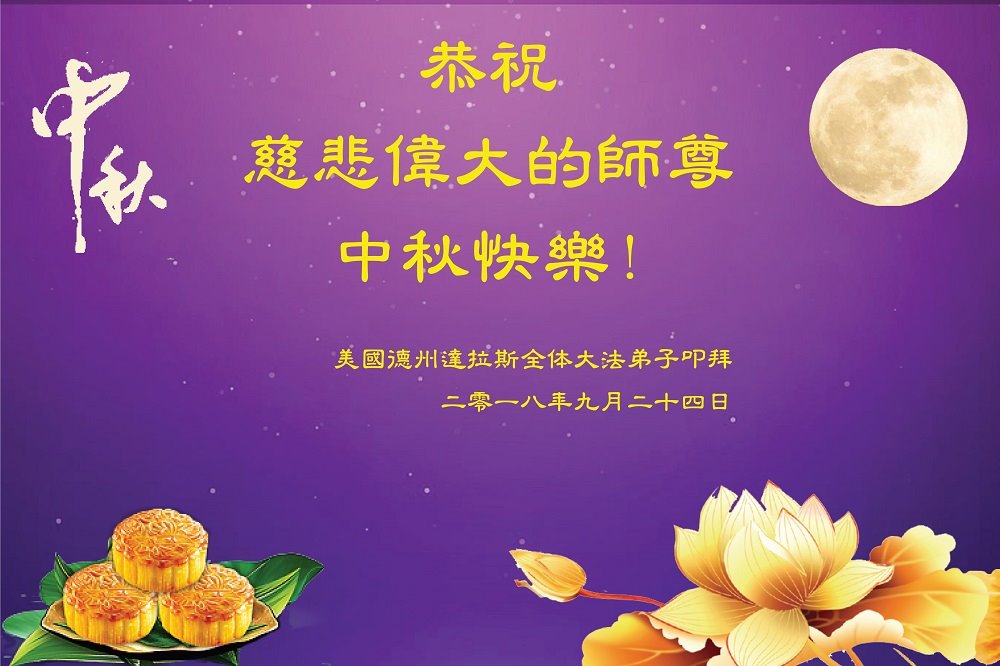 美国德克萨斯州达拉斯全体大法弟子恭祝慈悲伟大的师尊中秋快乐!