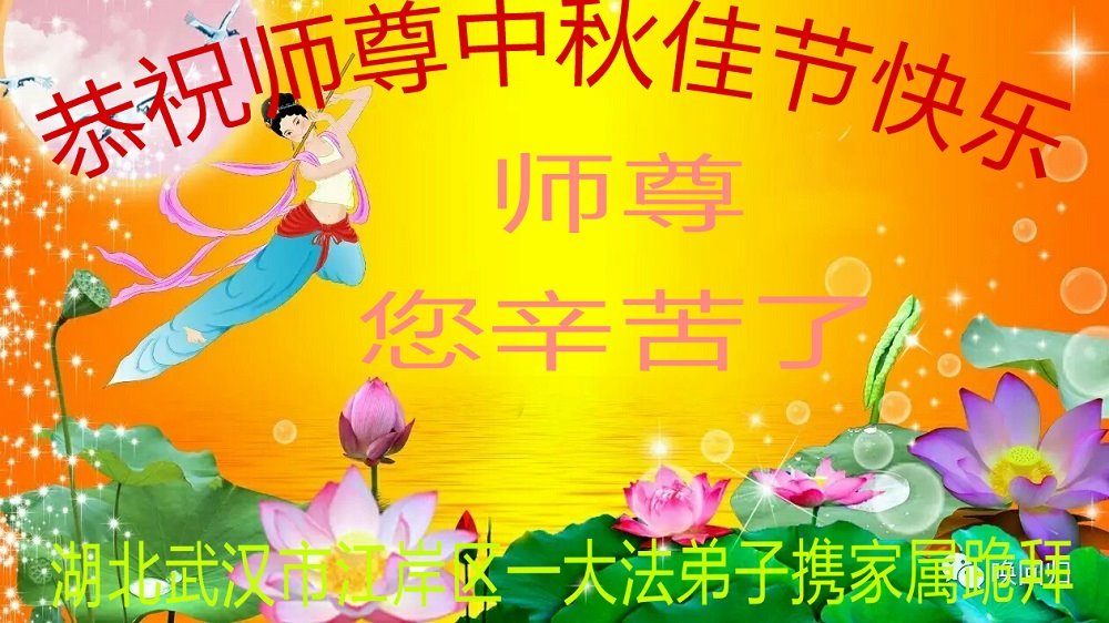 值此中秋佳节之际,感恩师尊的慈悲救度,道一声“师父 您辛苦了!”您为我们承受了太多太多,把情欲、业力满身的我们从地狱中捞起,给予了我们无比荣耀的称号——大法弟子。我们要听师父的话,学好法,同化法,做好三件事,跟师父回家! 湖北黄冈市全体大法弟子敬上! 湖北十堰一大法弟子和家属恭祝师父中秋佳节快乐!