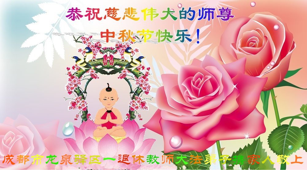 慈悲的师尊: 2018年中秋节就要到了,我和中国大陆所有教育系统大法弟子一样,心怀虔敬的感恩,恭祝师尊中秋节快乐! 在实修中,我悟到:理科学生学大法,能够思路清晰,融会贯通,事半功倍;文科学生学大法,能够思接千载,视通万里,文思泉涌,妙笔生花。教师学大法,智慧通达,讲解透彻,亲切而威严。管理层学大法,能无私为他,宽仁厚德,学校会井然有序。真善忍能让学生远离暴力和色情,友爱宽容,充满活力,使学校真正成为人才荟萃之地,放下个人奋斗的执着,反而得到更好、更多。 弟子们会修好自己,讲清真相,使教育界有缘之士沐浴大法甘露,明真相,得救度。 叩首! 2018年9月21日 四川省成都一退休教师大法弟子携家人恭祝慈悲伟大的师尊中秋节快乐!