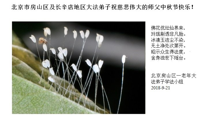 佛花优昙仙界来 玲珑体透非凡胎 冰清玉洁尘不染 无土净处次第开 昭示众生得法度 舍身浊世下瑶台 北京房山区及长辛店地区大法弟子祝慈悲伟大的师父中秋节快乐! 北京房山区一老年大法弟子学法小组 2018年9月21日 北京大法弟子恭祝慈悲伟大的师尊中秋节快乐!
