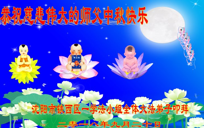 戊戌年的中秋快到了,我们学法小组的全体大法弟子衷心地祝师父中秋快乐!在师父巨大付出延续的时间里多救人,做好师父要的三件事,我们只有精進实修,不辜负师父希望。等师父和我们早日团圆,师徒相见! 辽宁省沈阳市于洪区大法弟子敬祝师父中秋节快乐!