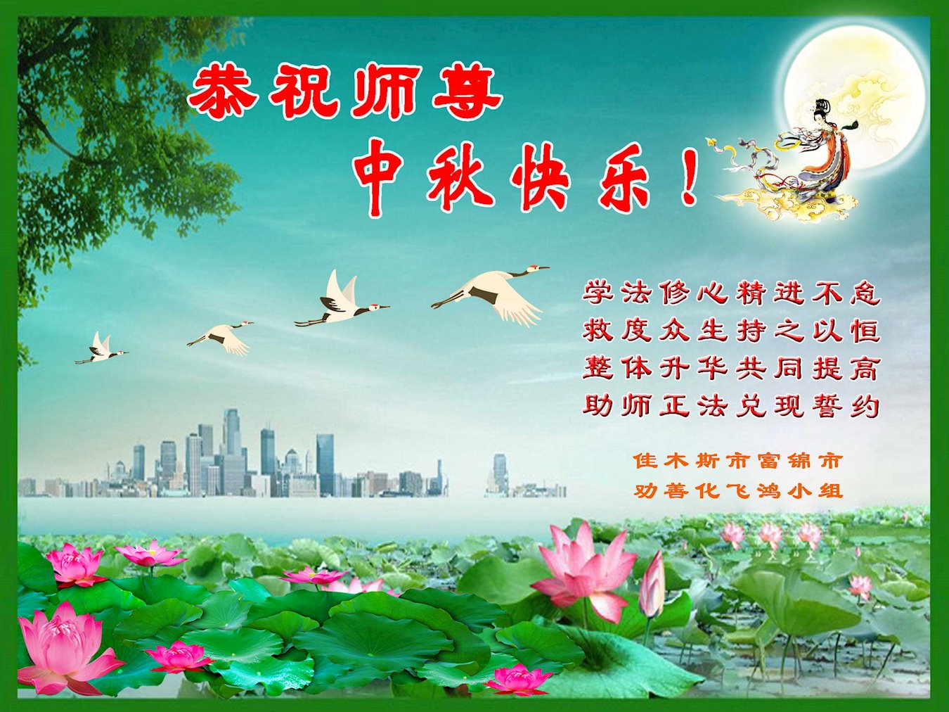 学法修心精進不怠, 救度众生持之以恒。 整体升华共同提高, 助师正法兑现誓约。 佳木斯市富锦市劝善化飞鸿小组 黑龙江省佳木斯市一大法弟子恭祝慈悲伟大的师父中秋快乐!