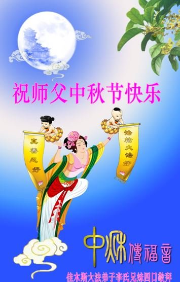 弟子谢谢师父的慈悲救度,师父您辛苦了!法轮大法好! 真善忍好! 佳木斯郊区叔侄女俩大法弟子敬上 黑龙江省佳木斯长安桥老年学法小组全体大法弟子恭祝慈悲伟大的师父中秋节快乐!