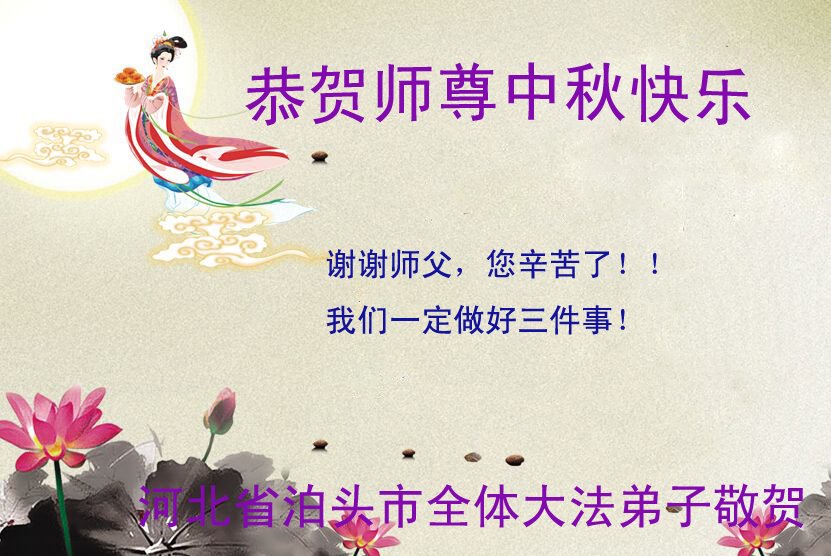 弟子们要谨记誓约,做好三件事,跟师父回家。 河北邯郸曲周县大法弟子恭祝师尊中秋节快乐!