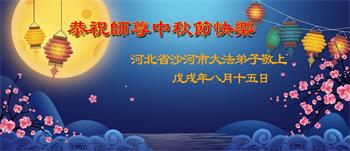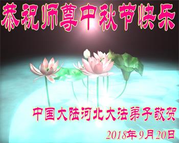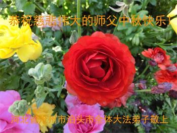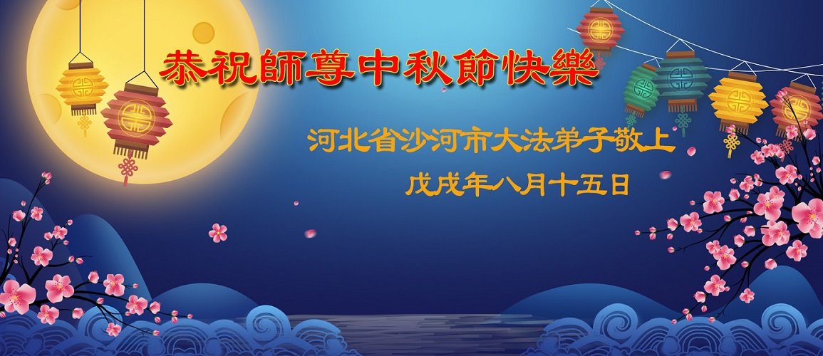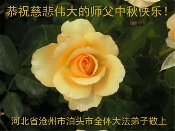恭祝师尊中秋节快乐!健康!请师父放心!在滚滚洪流中,弟子们一定逆流而上,一正压百邪!只做大法弟子该做的事,圆容好整体,不搞间隔,为救众生做好我们的项目,尽心尽力按法的要求做。做师父的真修弟子,让师父少操心,多欣慰!不辜负师父的慈悲苦度,早日随师父回家! 河北省沧州市泊头市全体大法弟子恭祝慈悲伟大的师父中秋快乐!