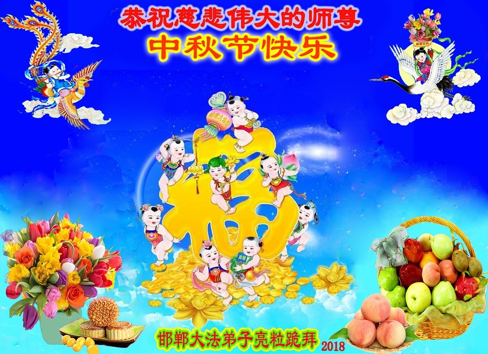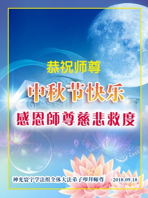 尊敬的师父您好!祝师父节日快乐! 中秋佳节快要到了,在这特殊的历史时期祝愿师尊节日快乐!谢谢师尊慈悲救度、师父您辛苦了! 山东省临清大法弟子 敬上 二零一八年九月十九日 山东省聊城市临清市大法弟子恭祝师父节日快乐!