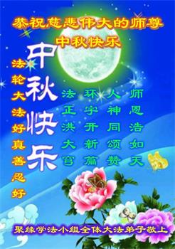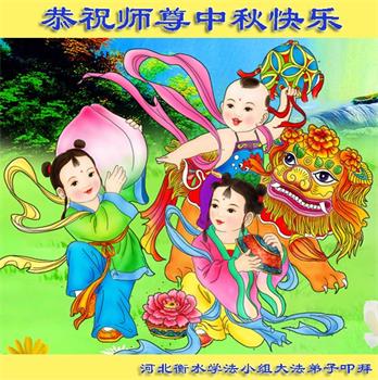 师父您好!我妻子修炼,我也受益匪浅,谢谢师父给我净化身体,在中秋节之际恭祝师父中秋快乐! 河北省沧州市东光县一学法小组全体同修恭祝师父中秋节好!