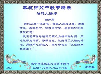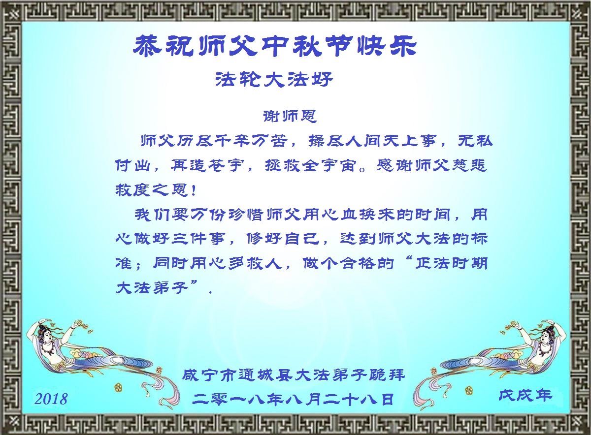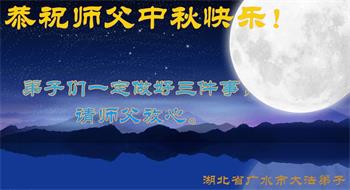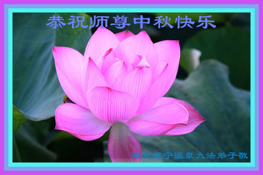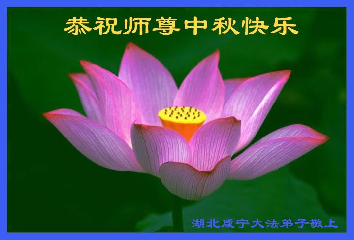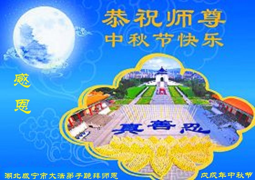慈悲伟大的师父好!师父辛苦了! 隔洋相望盼师尊, 中秋时节话感恩。 寰宇人间同一语, 谢谢师父转法轮。 世间万物皆定数, 邪恶疯狂大势去。 洪微苍宇换新颜, 还是挚谢创世主。 跪拜师父!合十。 湖北省天门市教育界大法弟子恭祝师父中秋节快乐!
